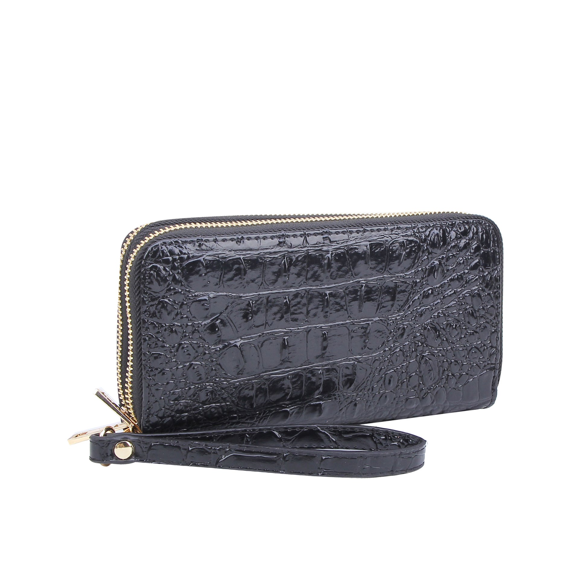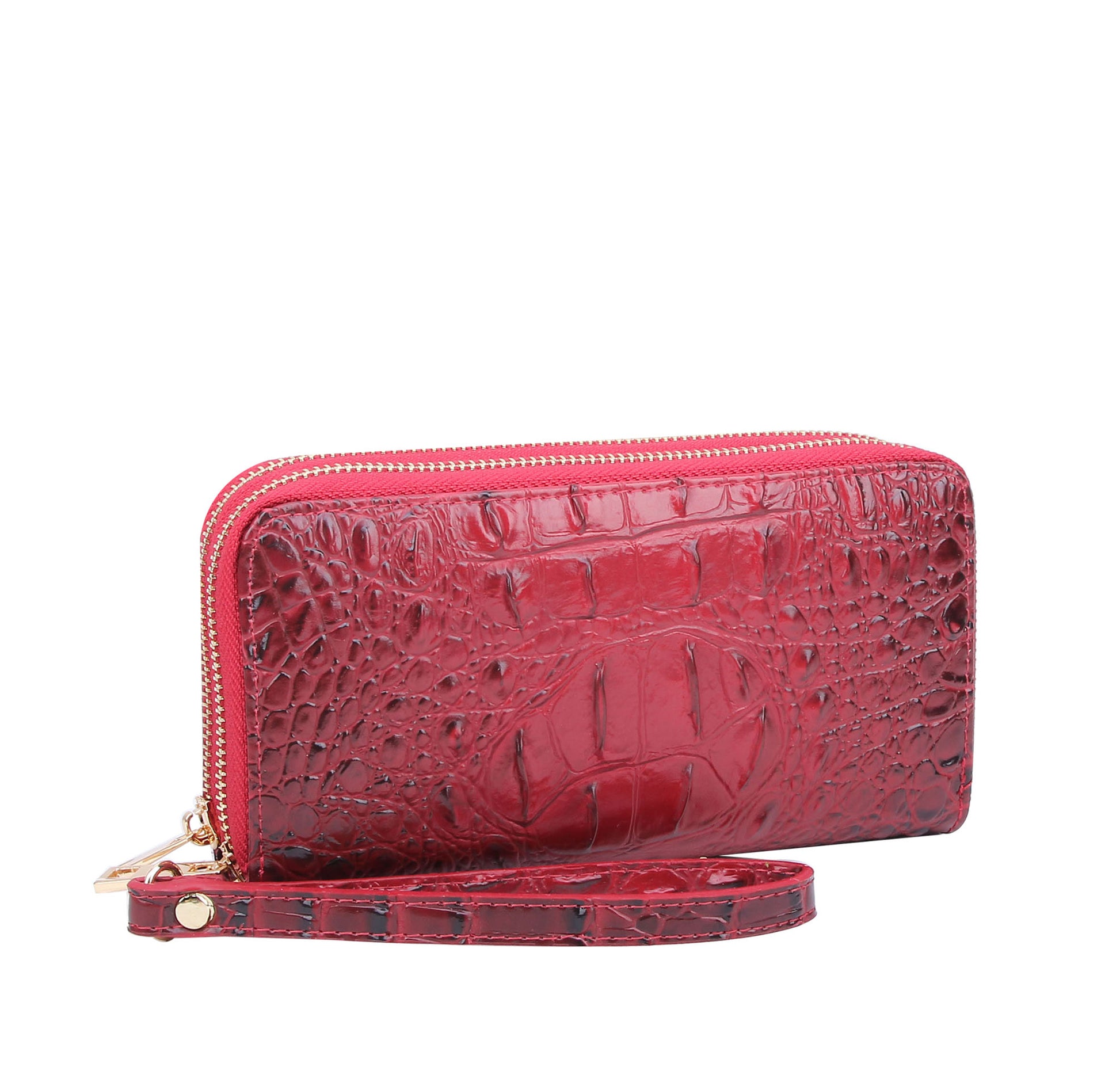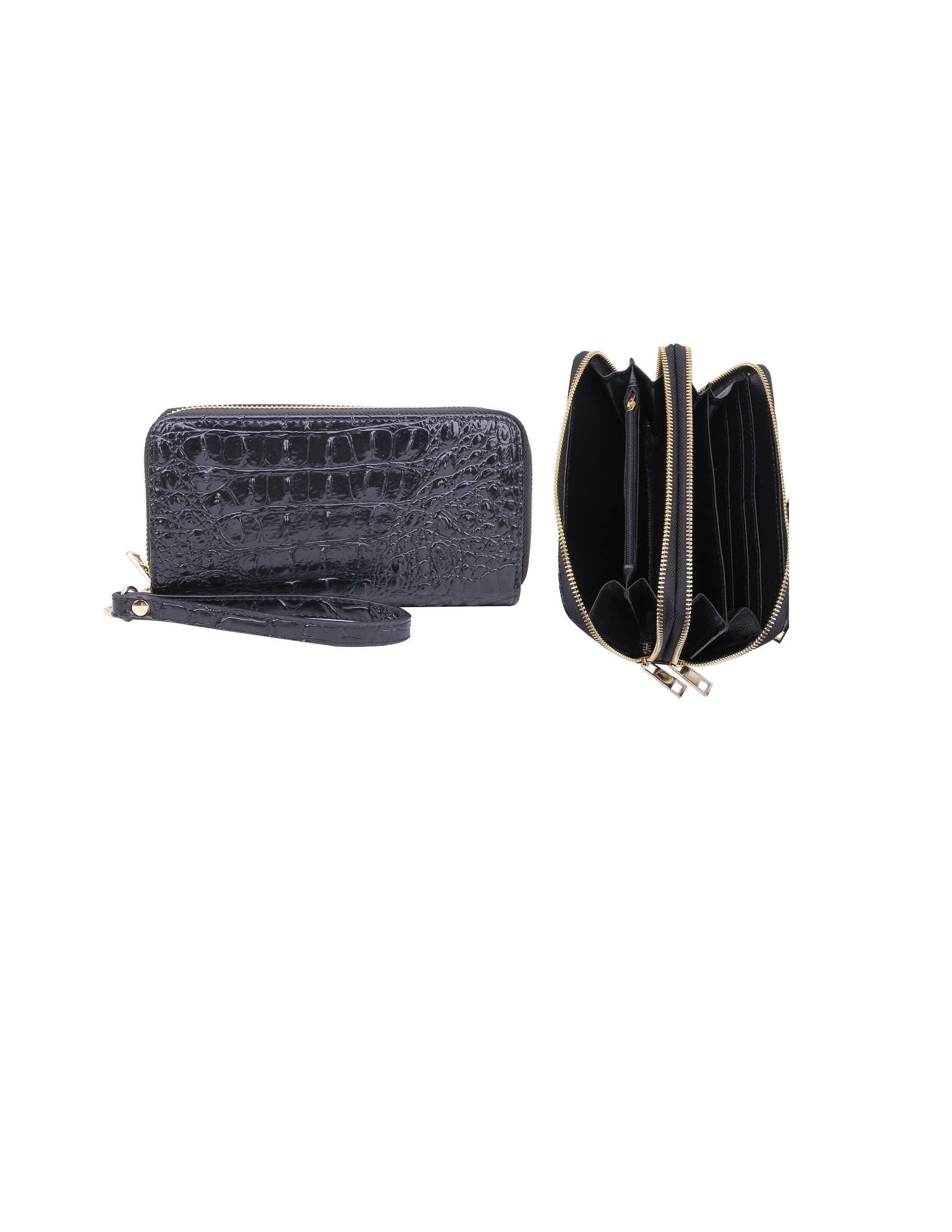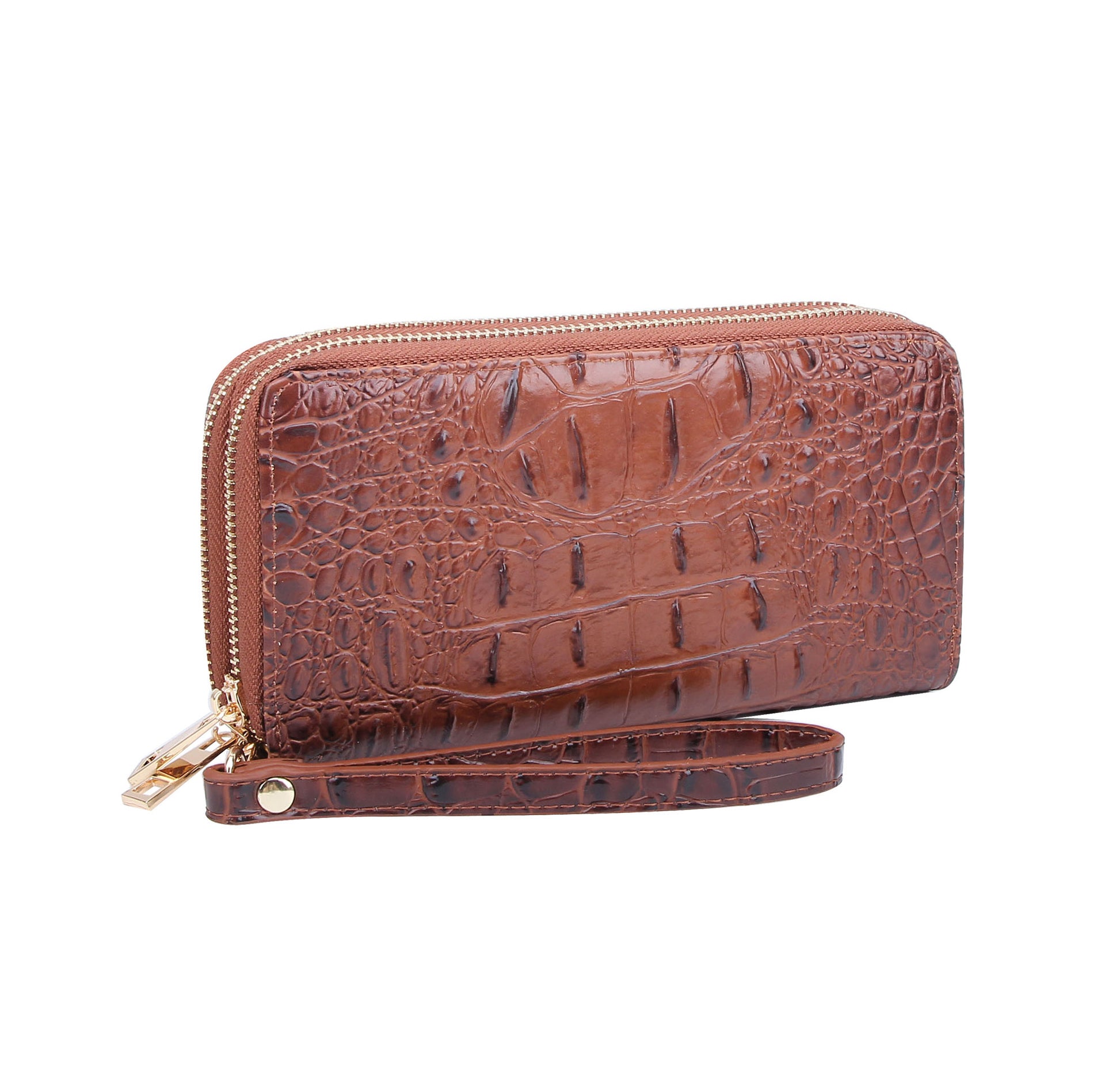 Large double zipper wallet with multiple compartments and 8 card slots made of croc like material. Wristlet holder is included. 7 1/2 X 1 1/2 X 4 Inches