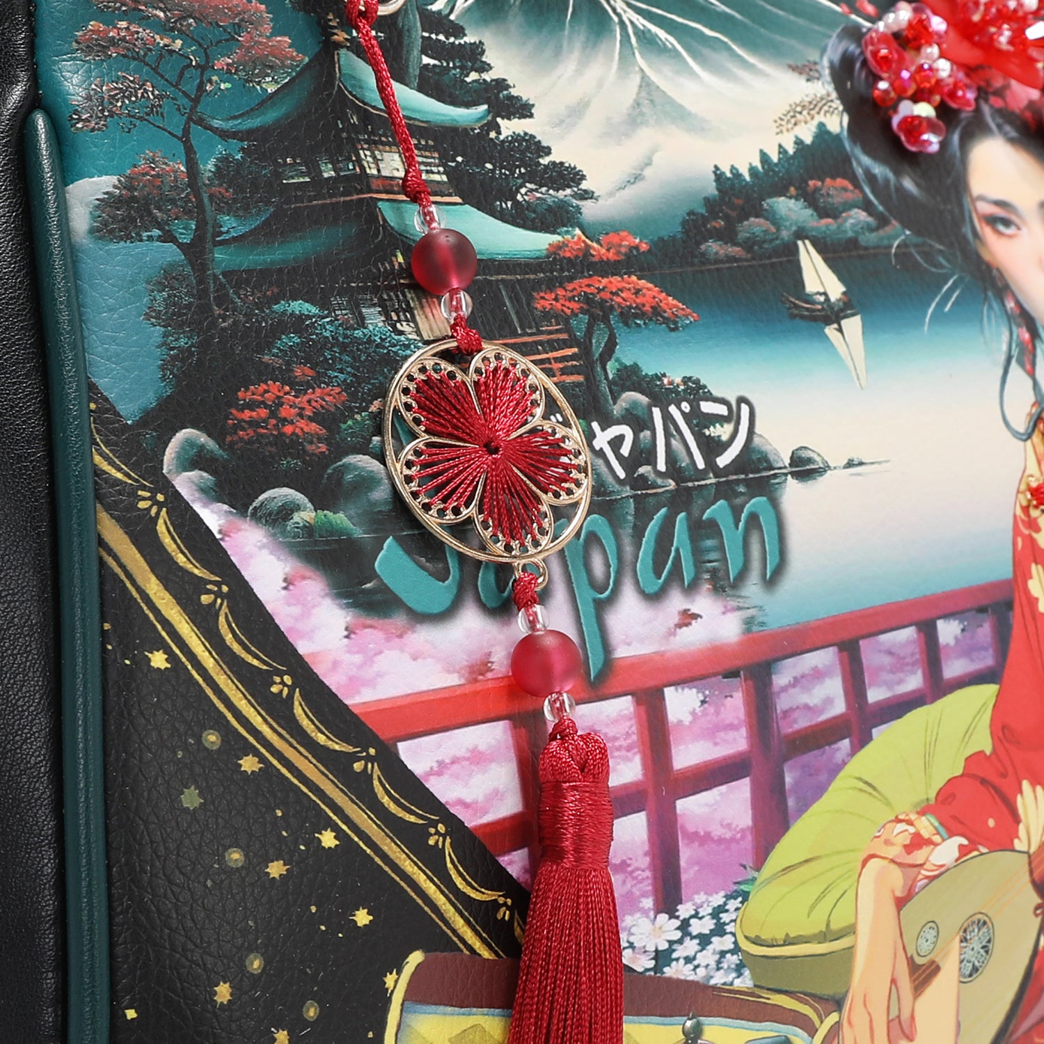 - Front is embellished with multicolored beads, flowers, and gold metal leaf motifs