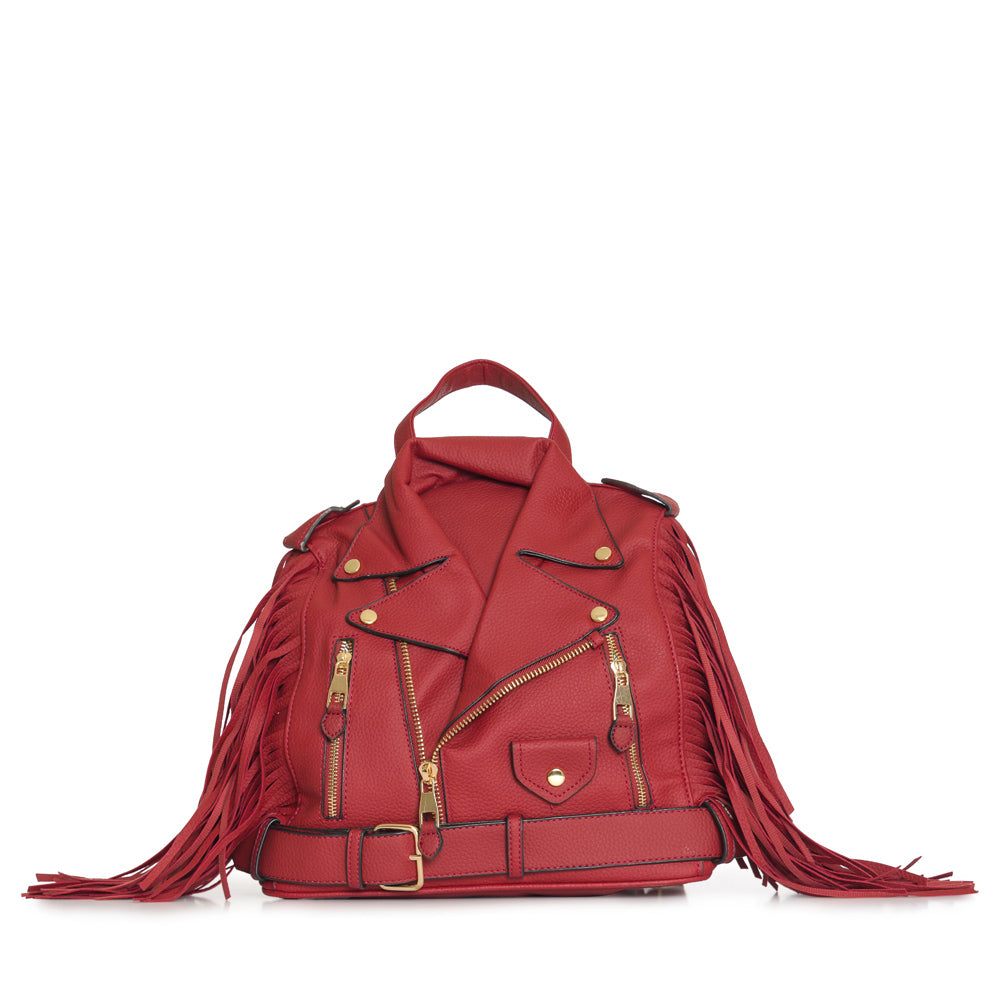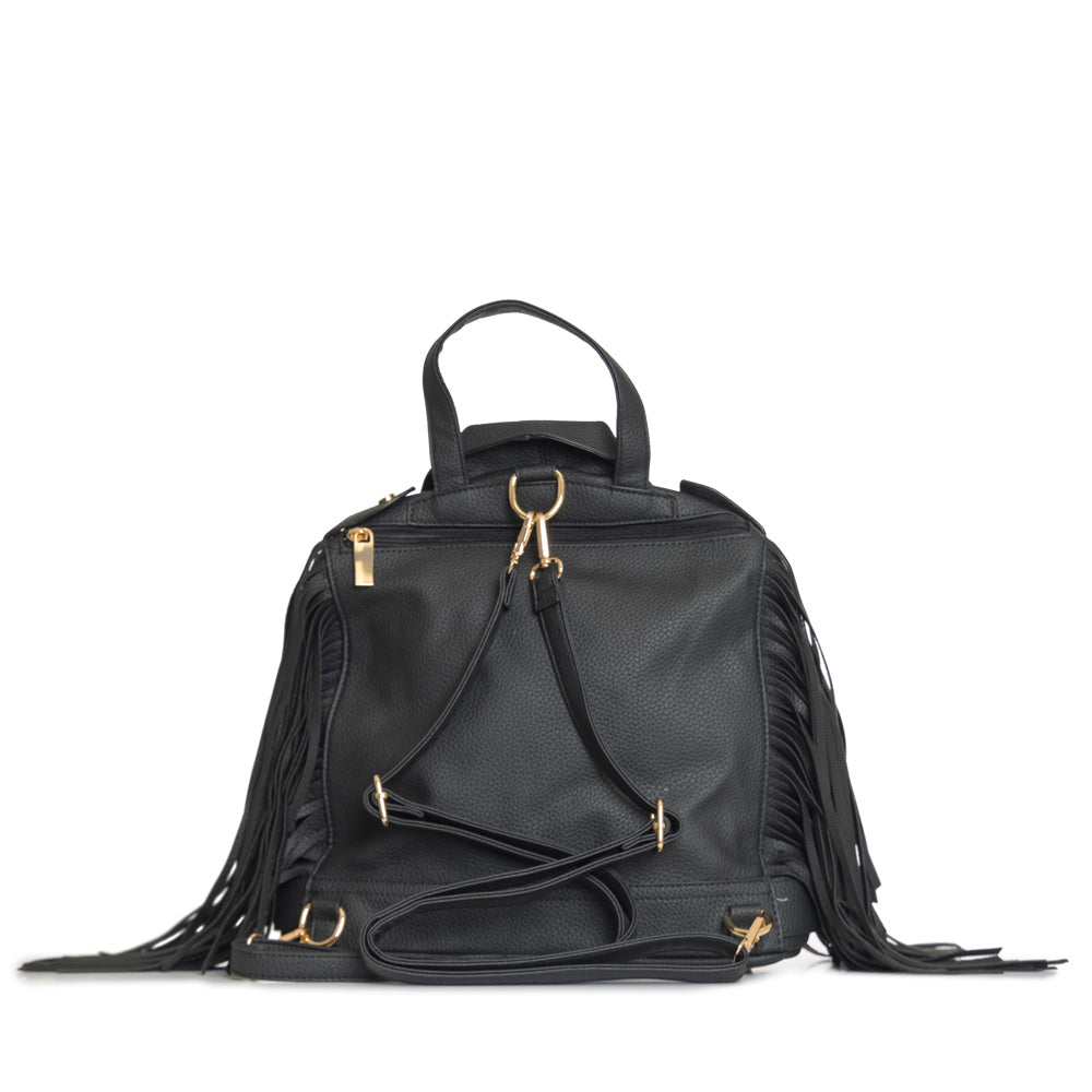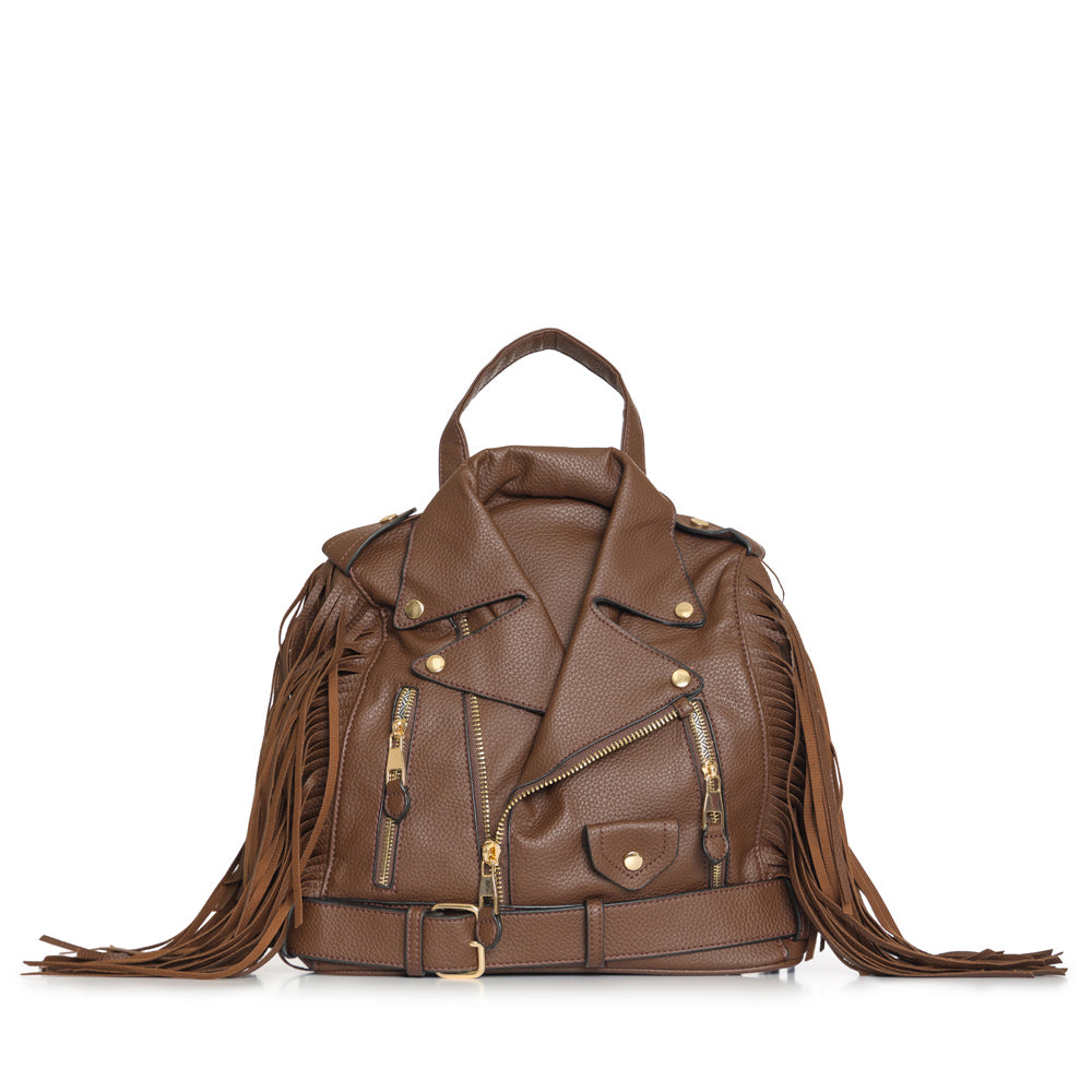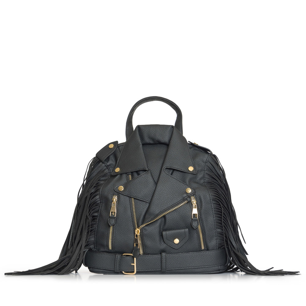 Fringed jacket backpack in soft faux leather. 12 1/2"L x 5"W x 11 3/4"H