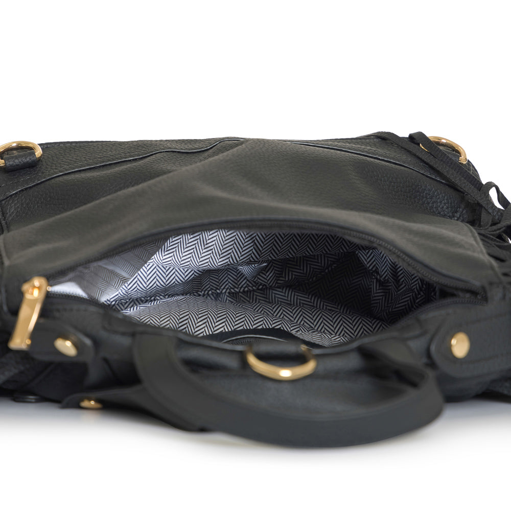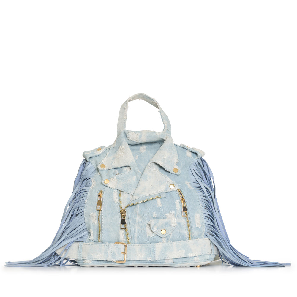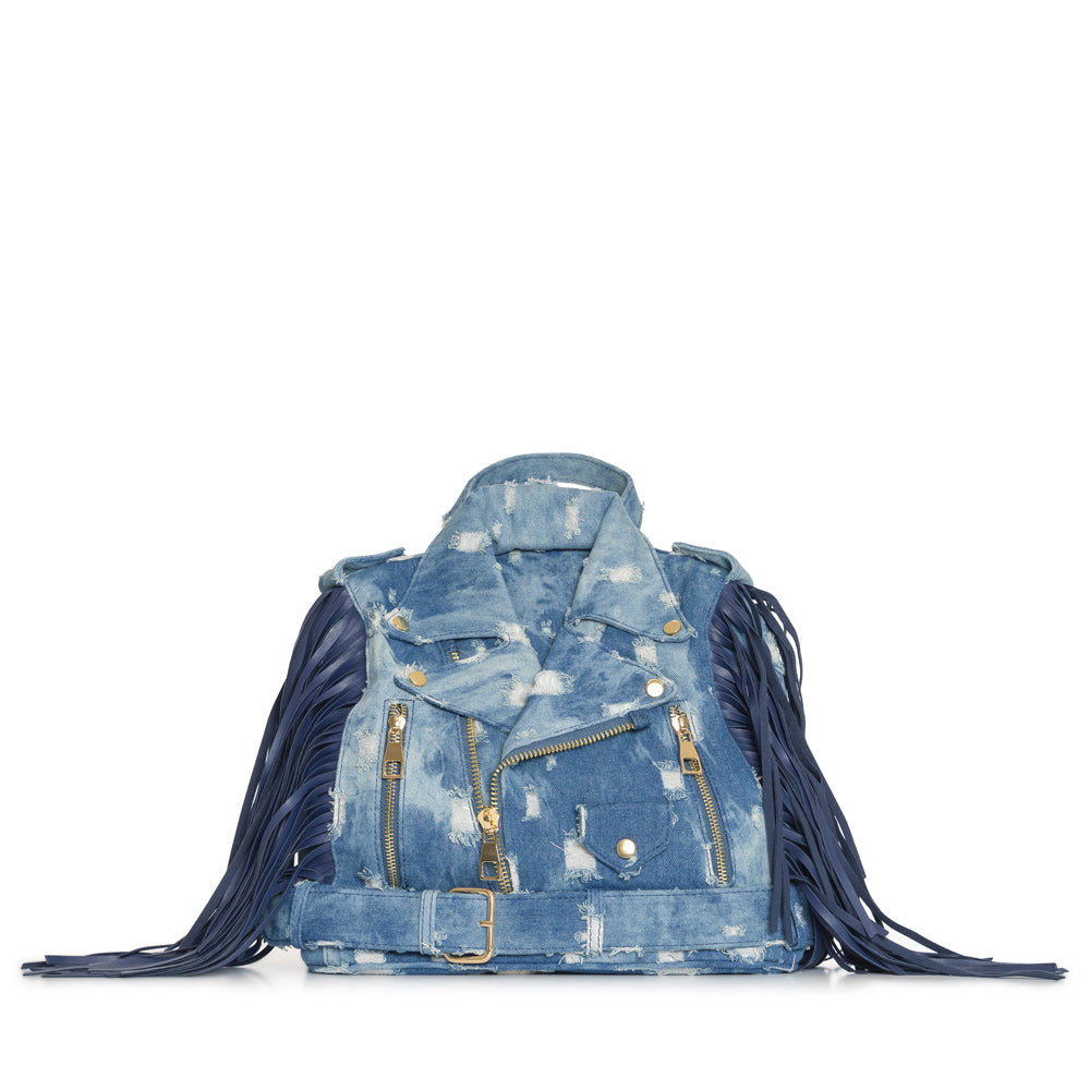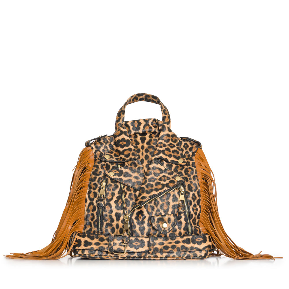 Fringed jacket backpack in soft faux leather. 12 1/2"L x 5"W x 11 3/4"H
