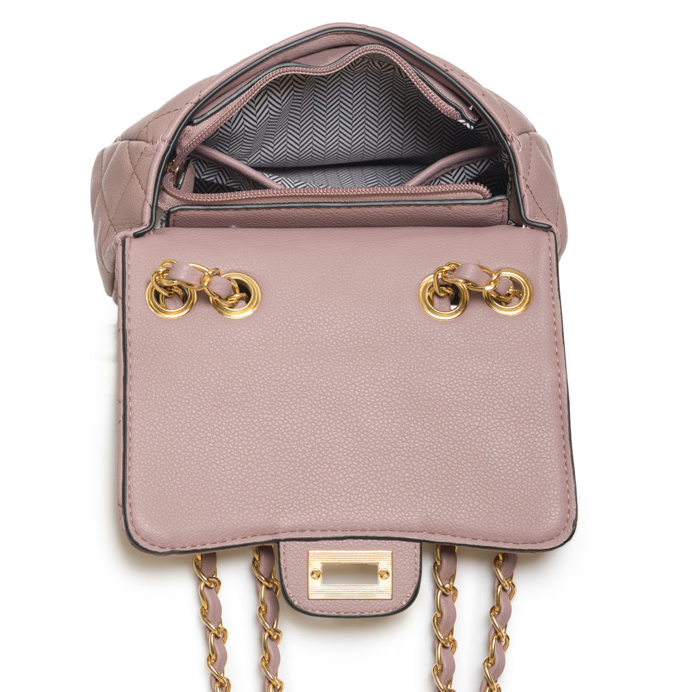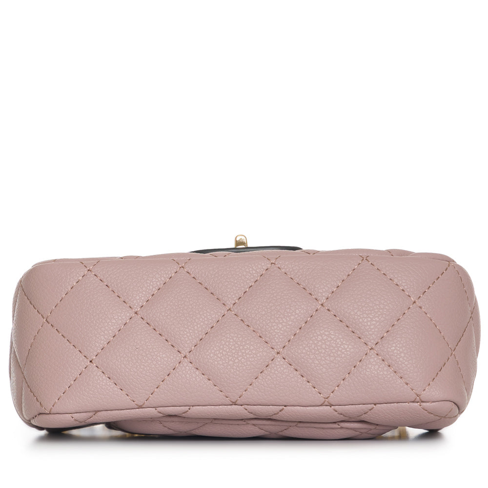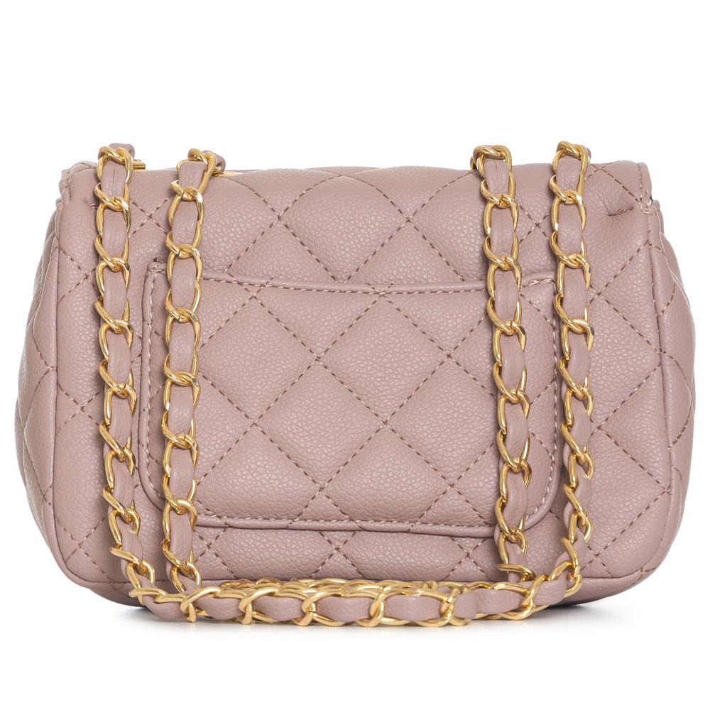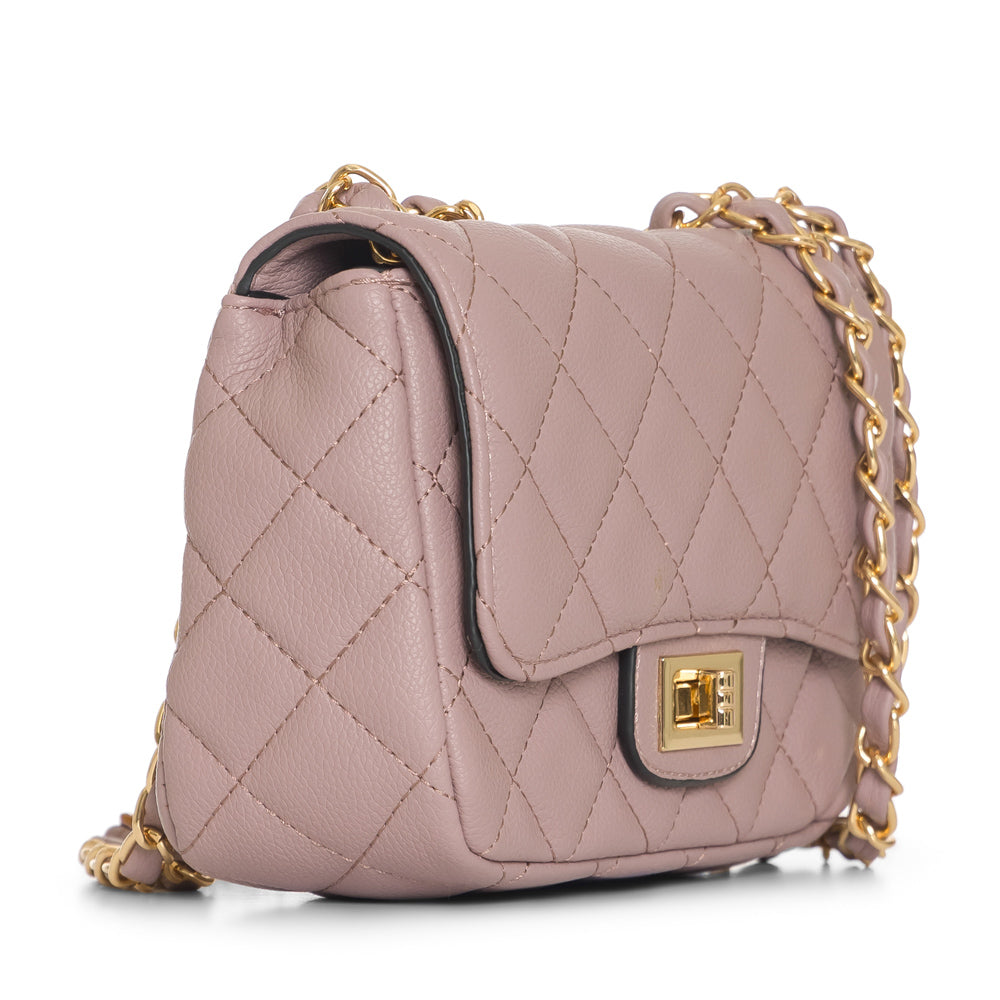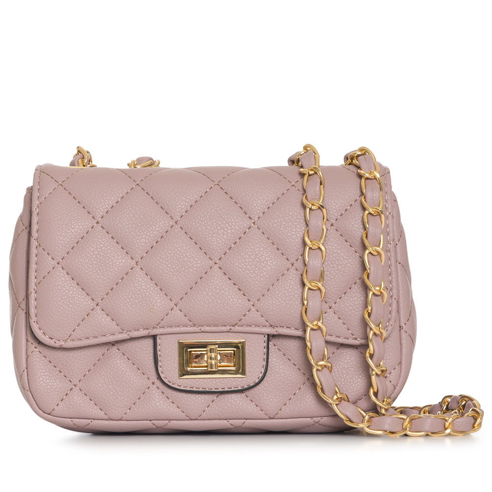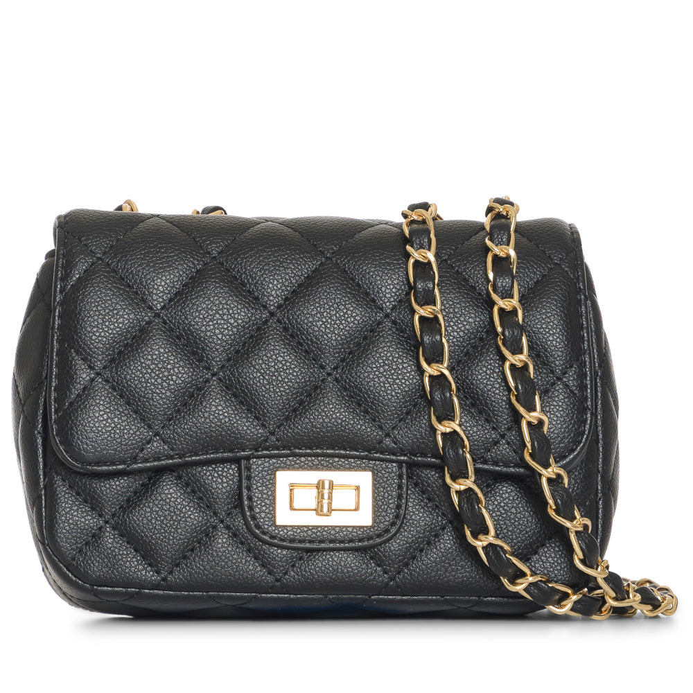Women's fashion quilted handbag purse with turn lock in gold trim. 7 7/8"L x 2 5/8"W x 5 1/2"H