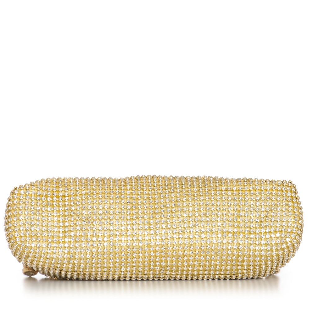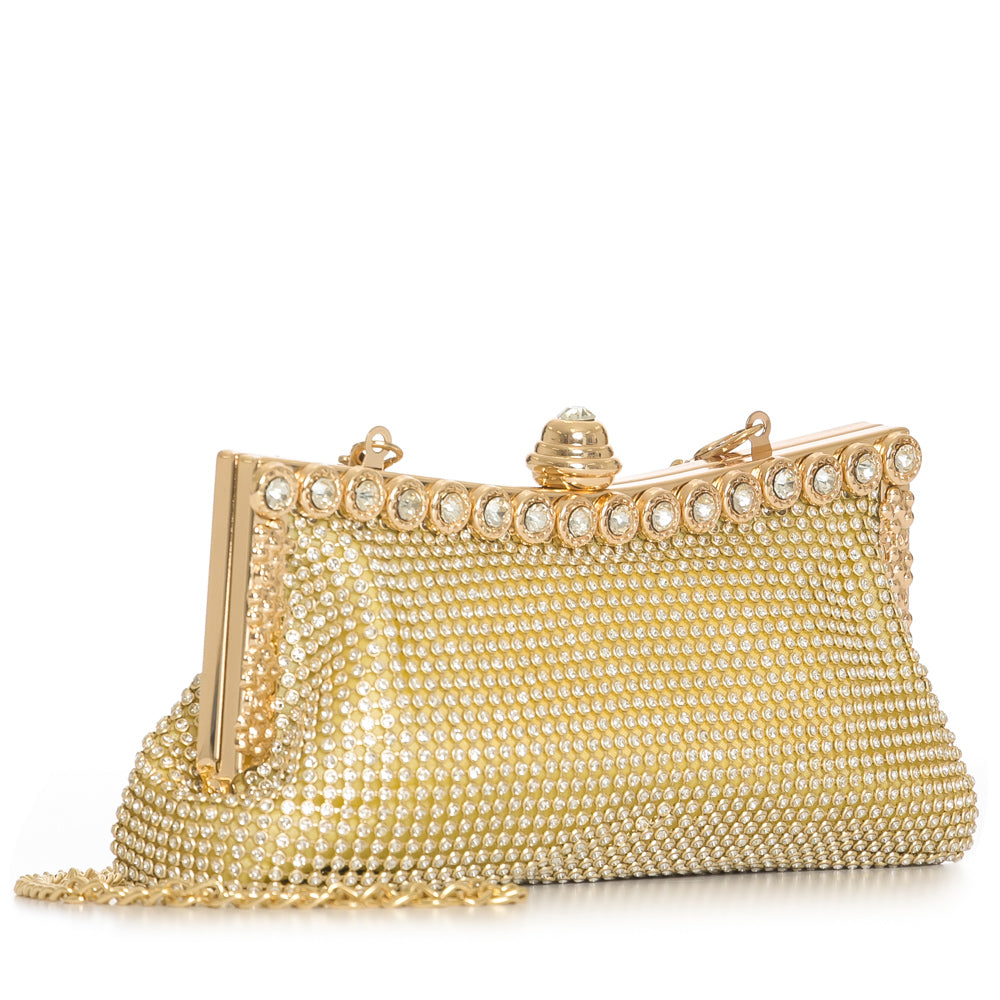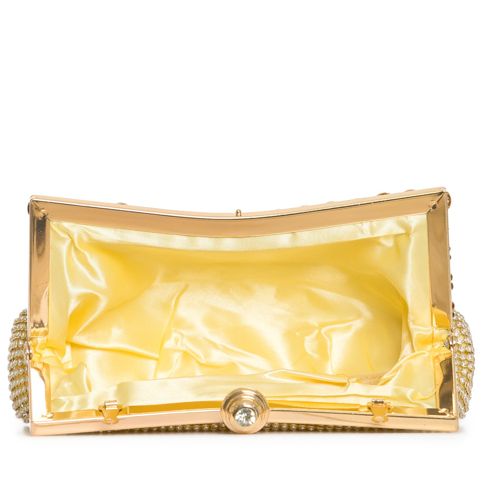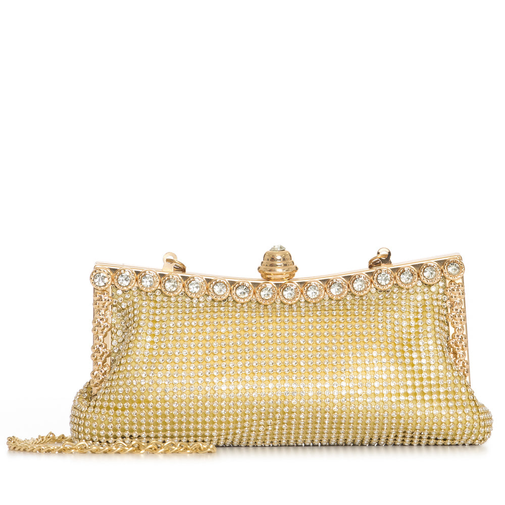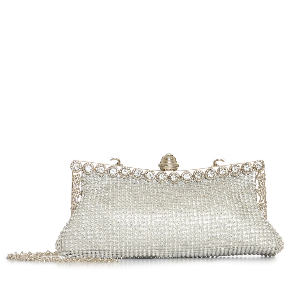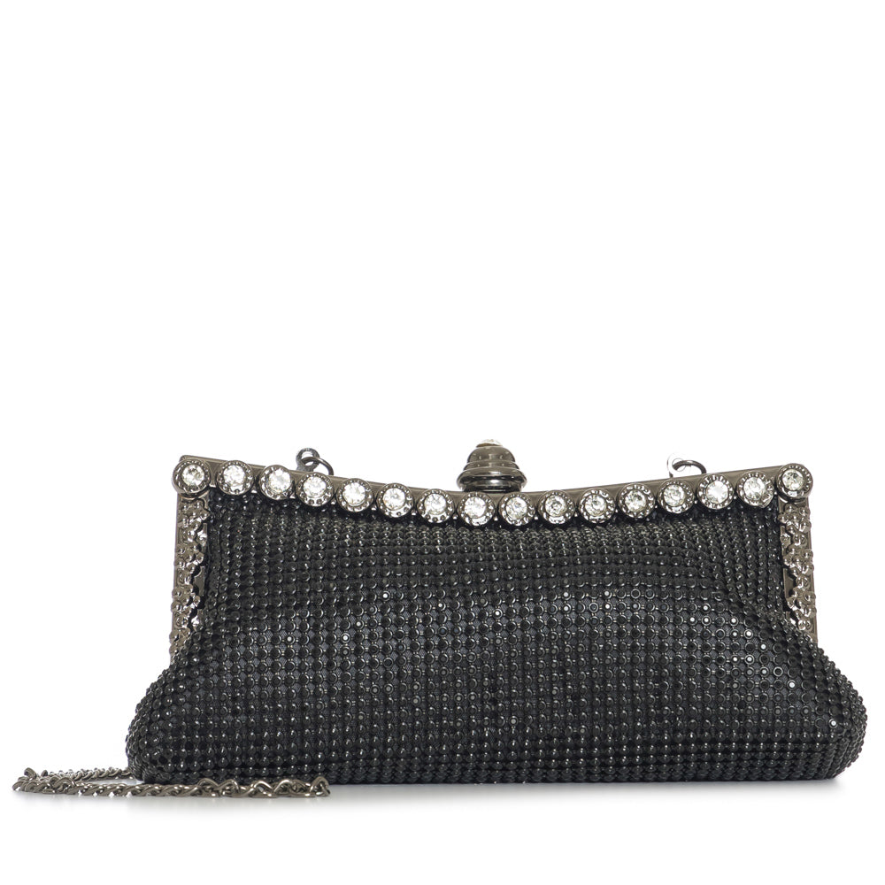 Fashion evening purse clutch with rhinestone frame with meta chain strap. 6 3/4" x 3 1/4" 23" from base to top