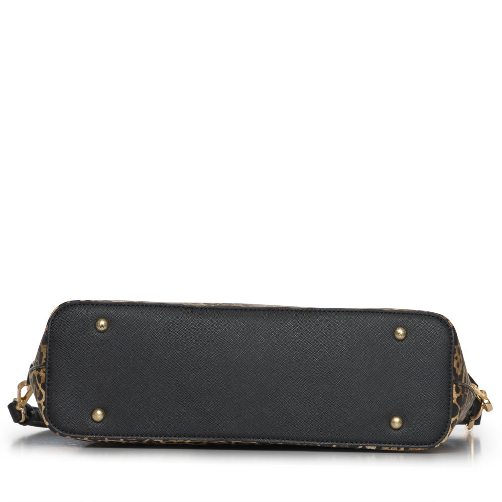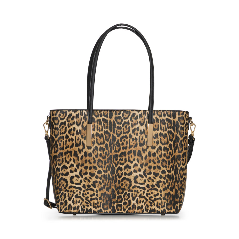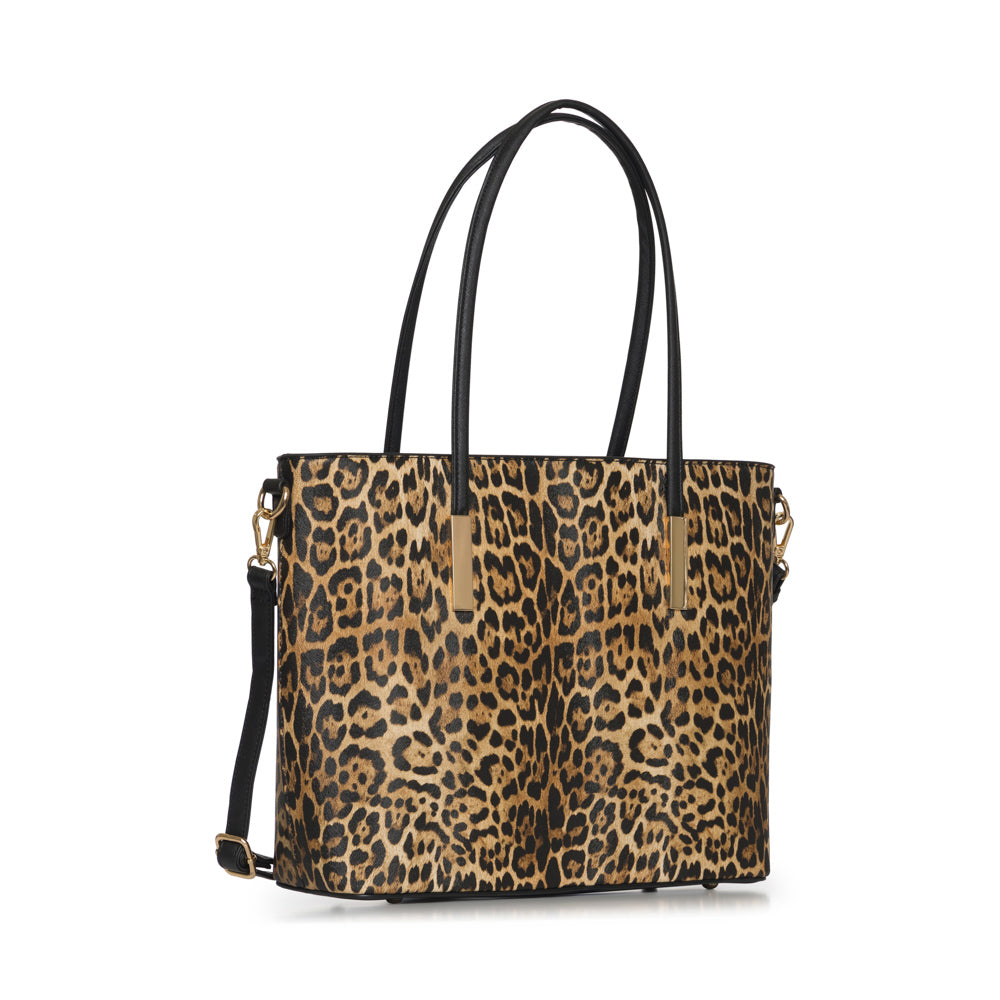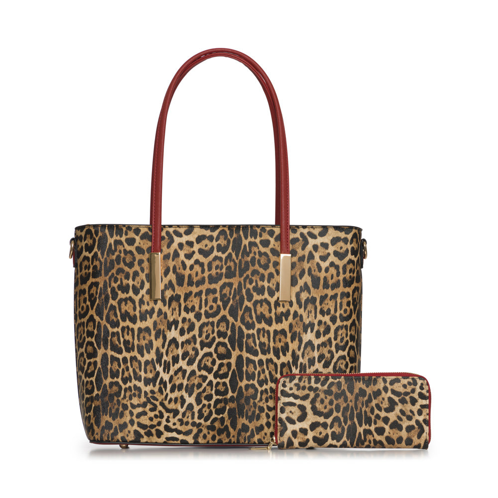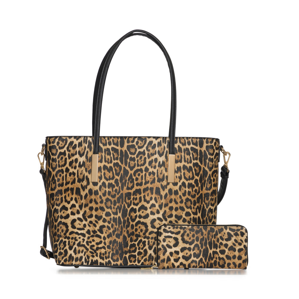 2 in 1 Leopard tote handbag with matching wallet. Adjustable strap included. Peta approved. Tote: 16"L x 4 1/2"W x 11 1/2"H Wallet: 7 1/2"L x 3 1/2"H