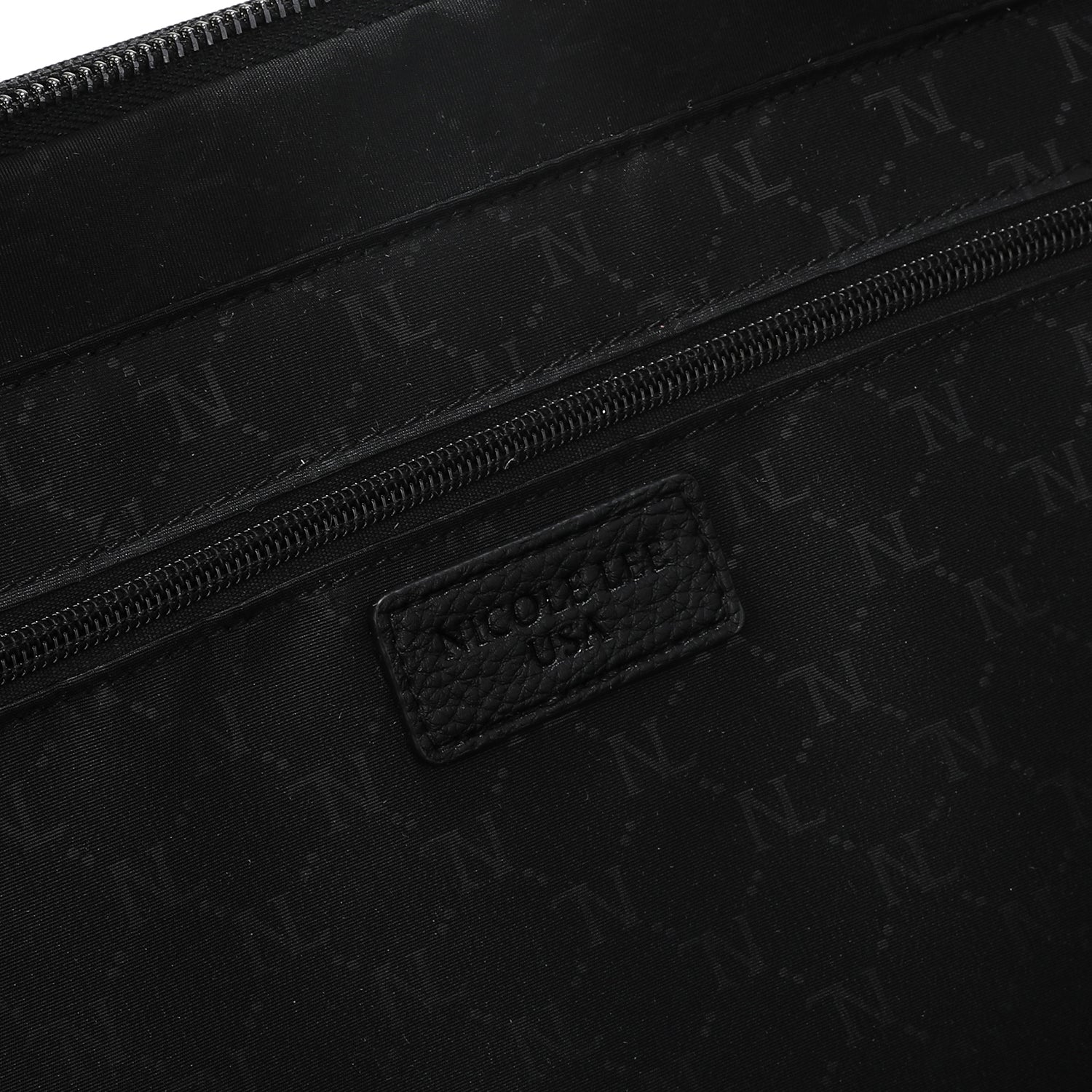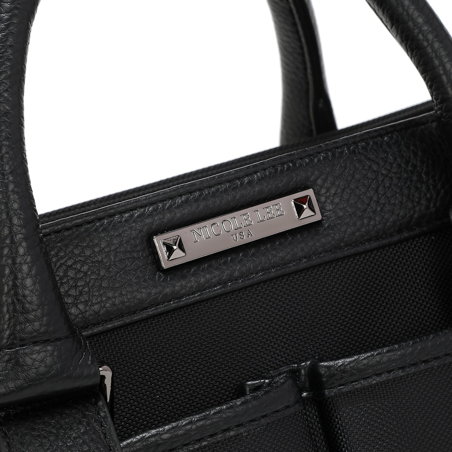 MENS MULTI POCKET BRIEFCASE Men's vegan leather and polyester briefcase with its sleek, slim silhouette, it exudes elegance while offering practicality with multiple pockets for effortless organization. A convenient strap on the back allows you to easily slide into luggage handles.