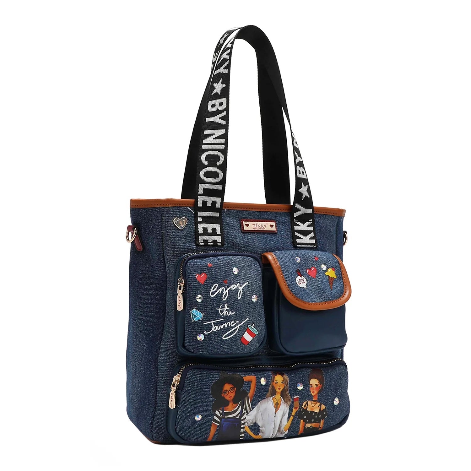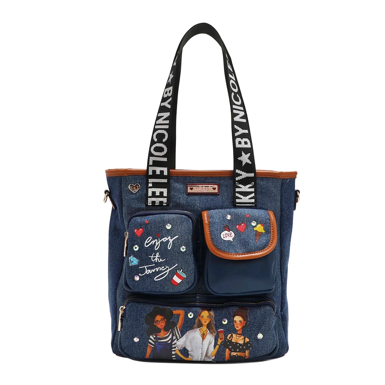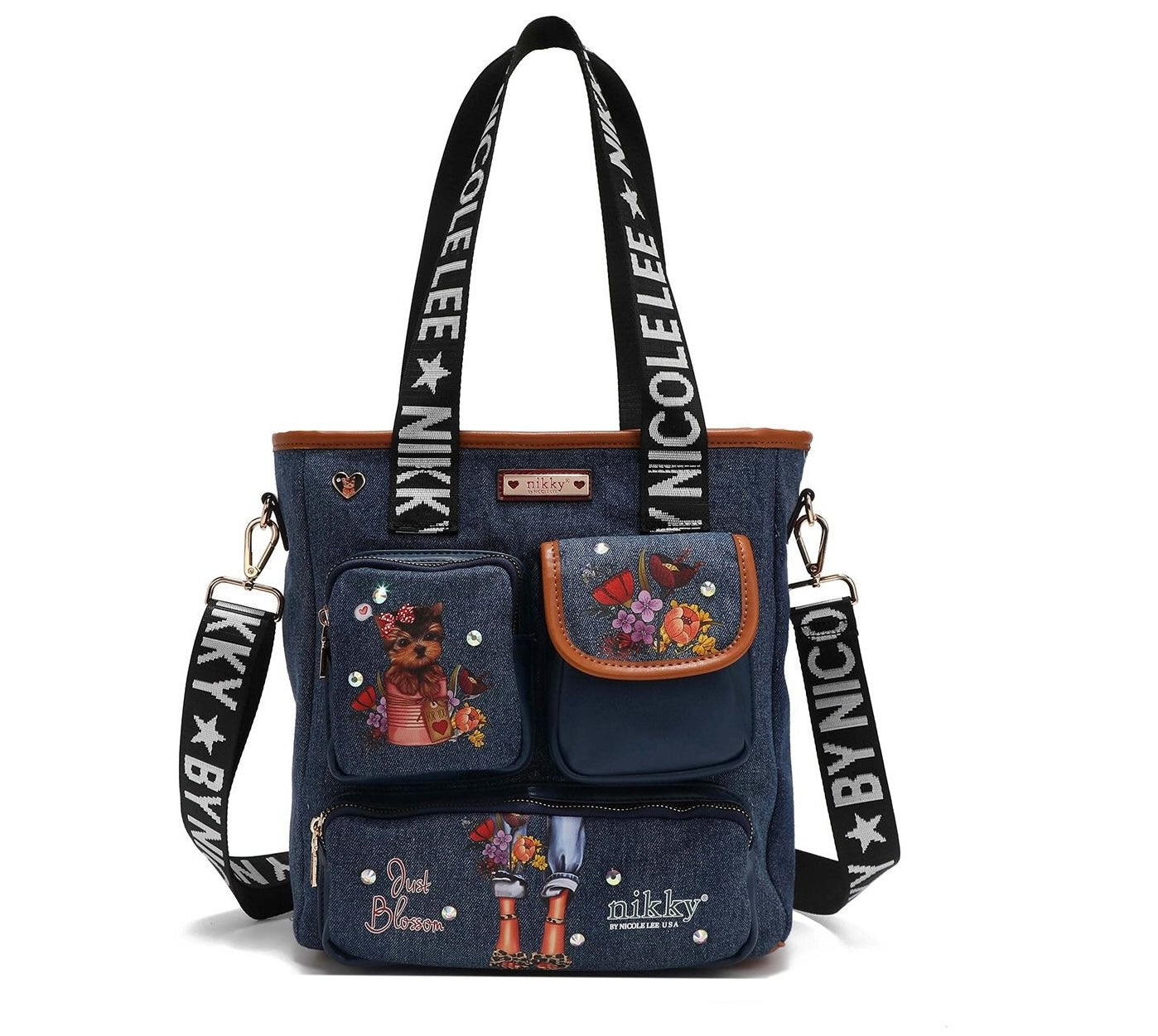 NIKKY by Nicole Lee. Adorable denim tote crossbody handbag with guitar strap. 110 3/4"L x 4"W x 11 1/2"H
