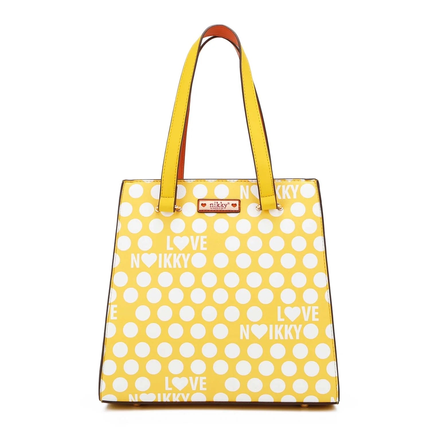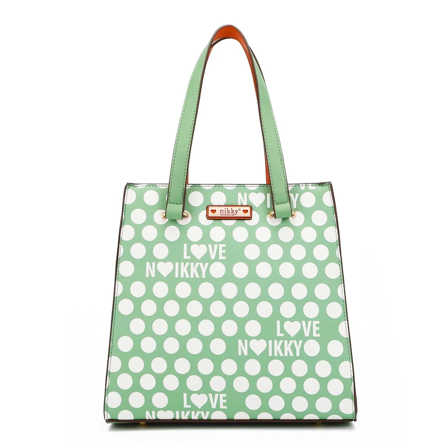 Glamorous polka dot tote handbag made with smooth eco friendly leather. Adjustable strap included. NIKKY by Nicole Lee