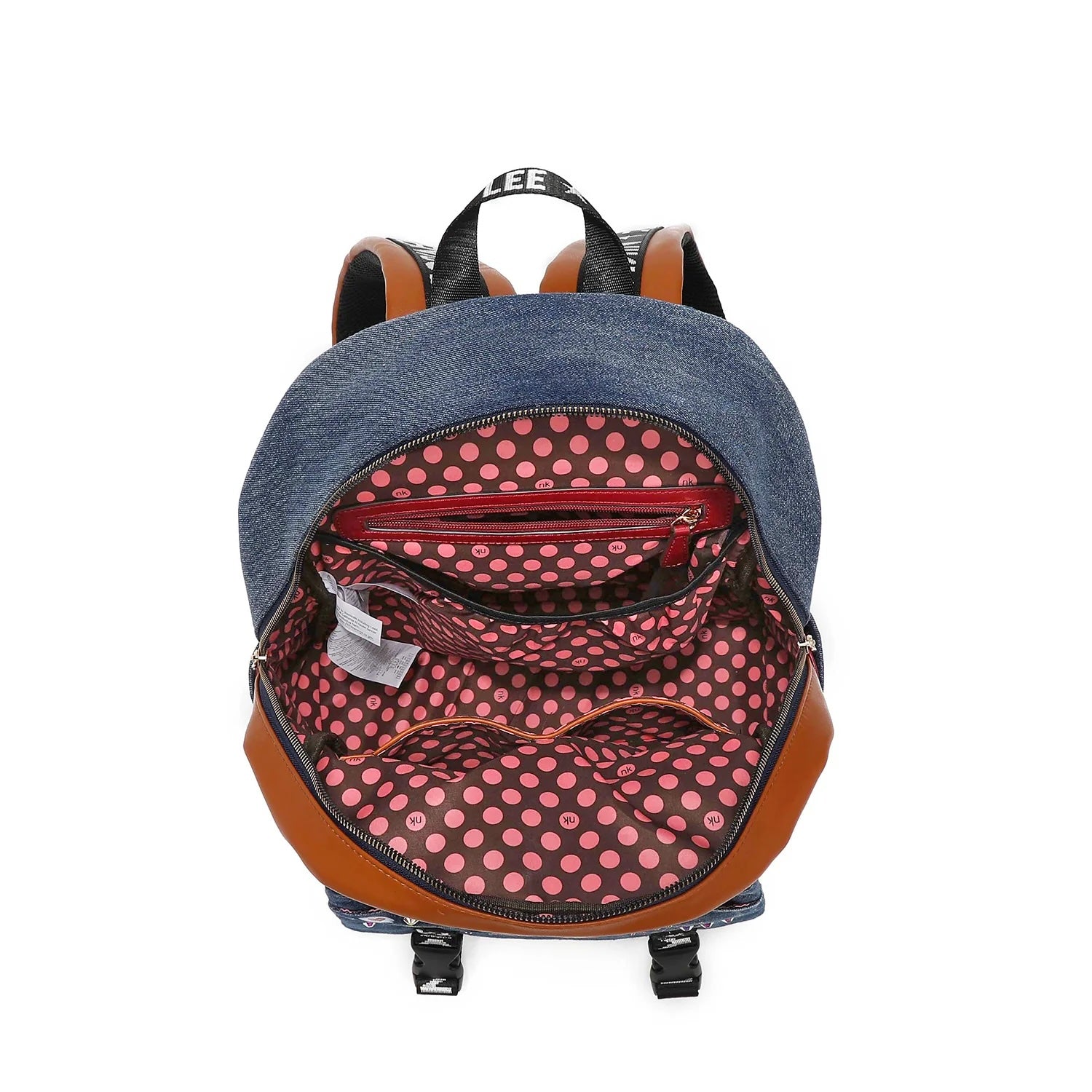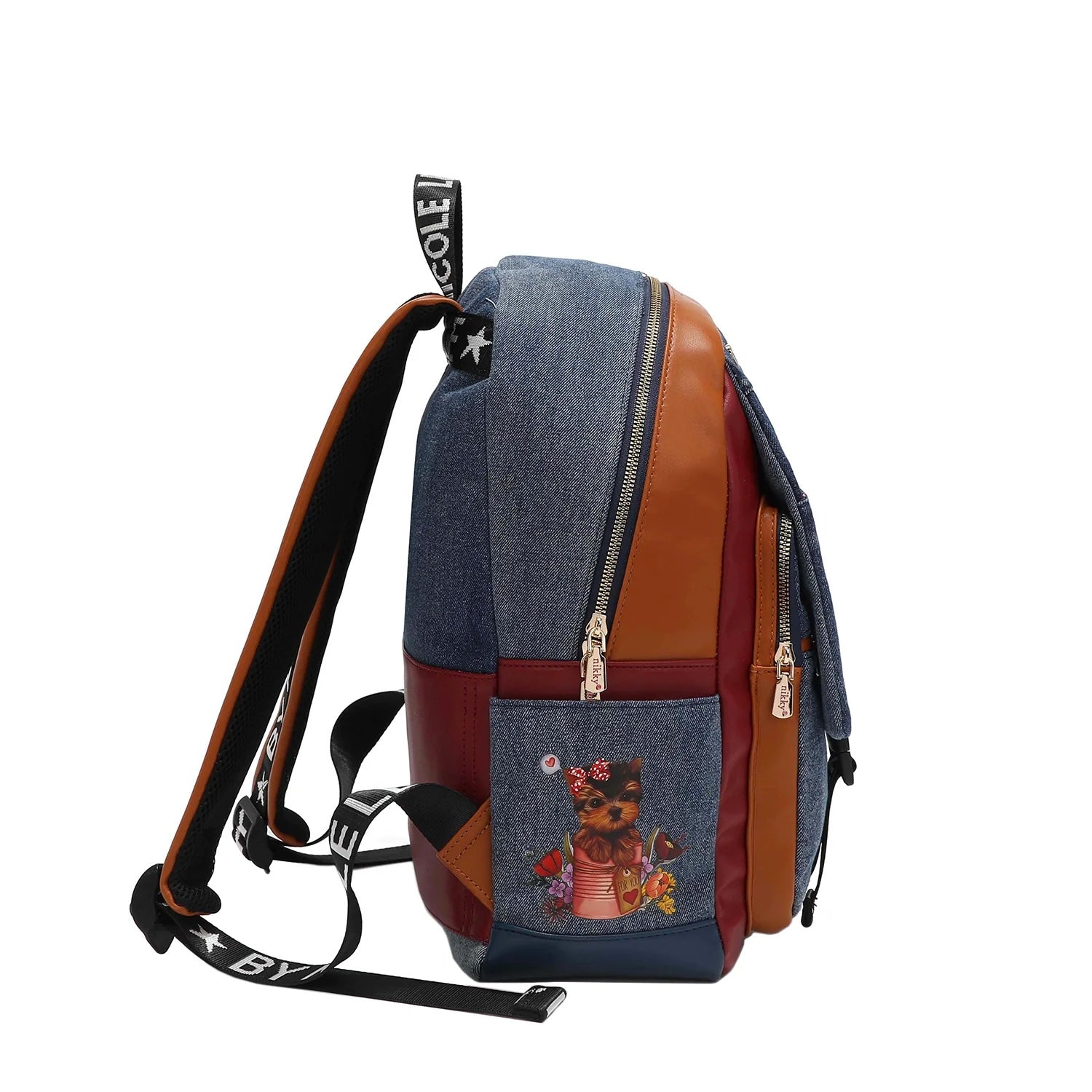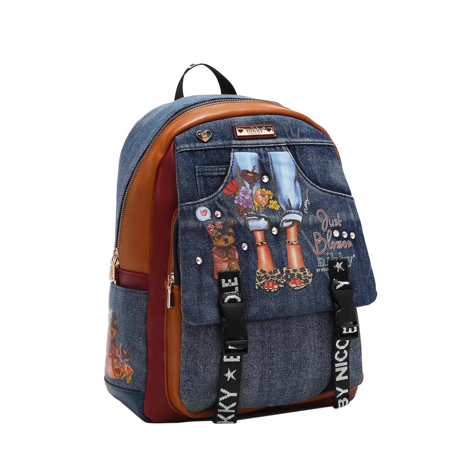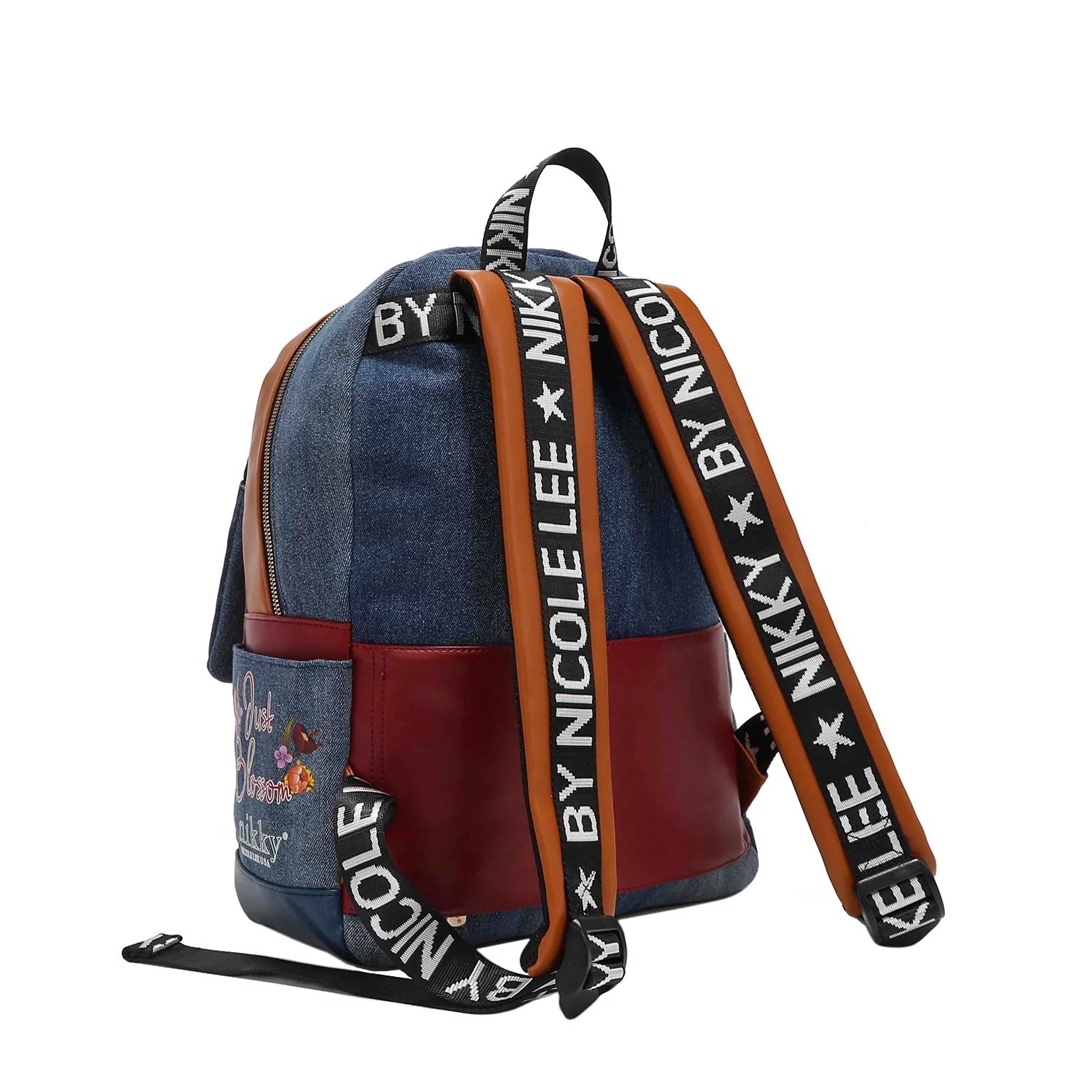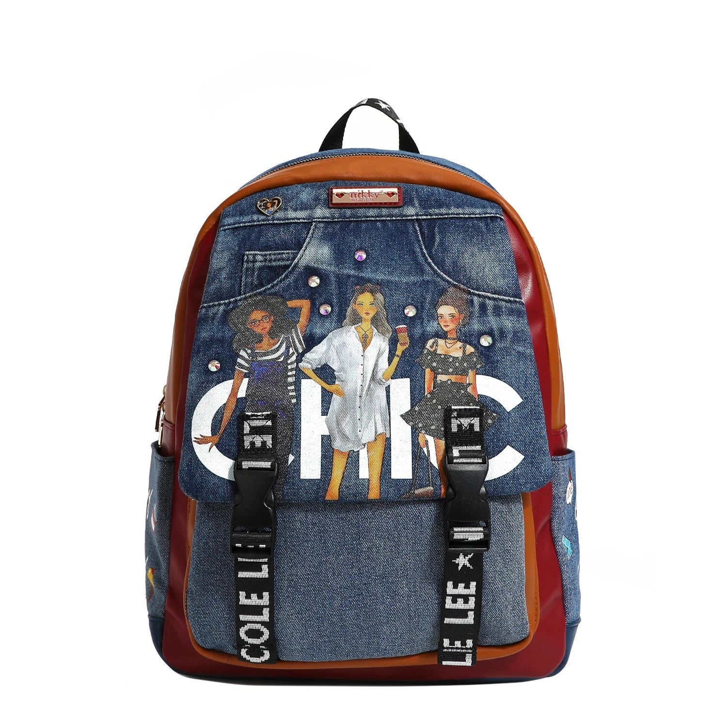 NIKKY by Nicole Lee. Stylish denim travelers school backpack with multiple compartments. 11 1/4"W x 15 1/4"L