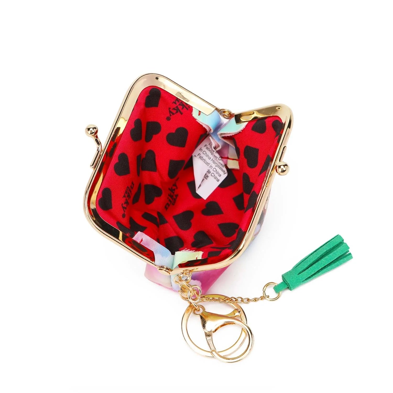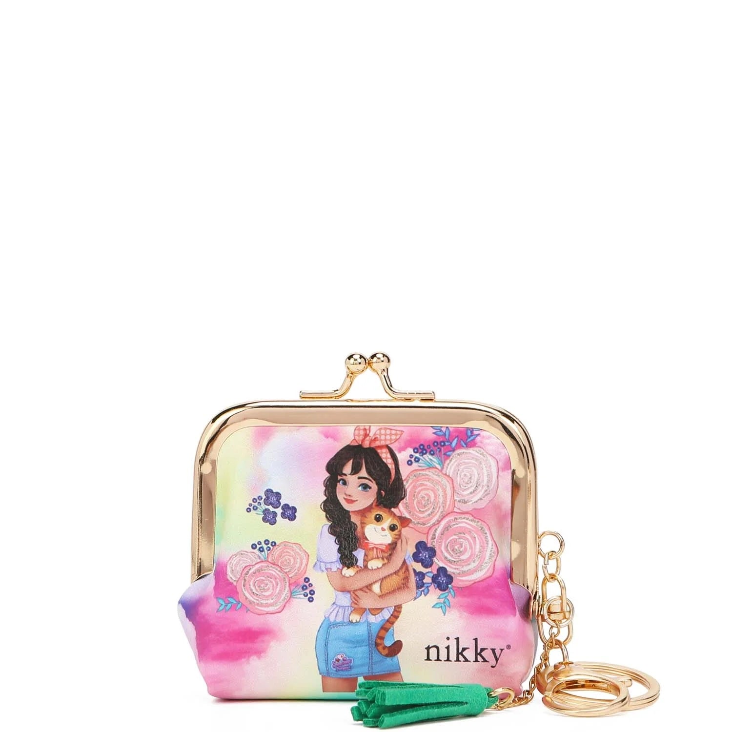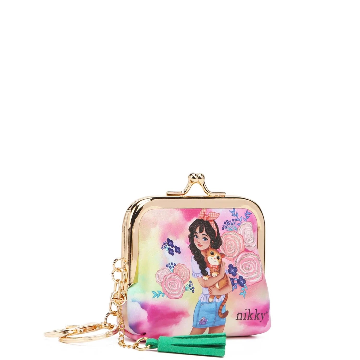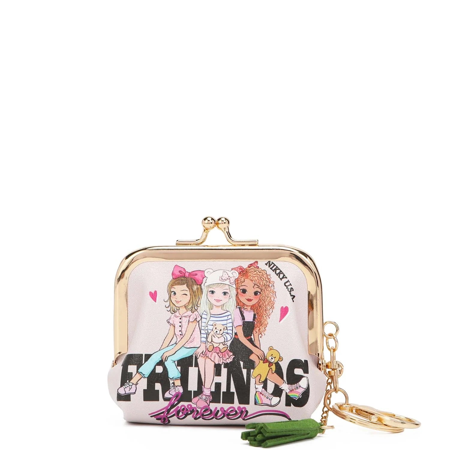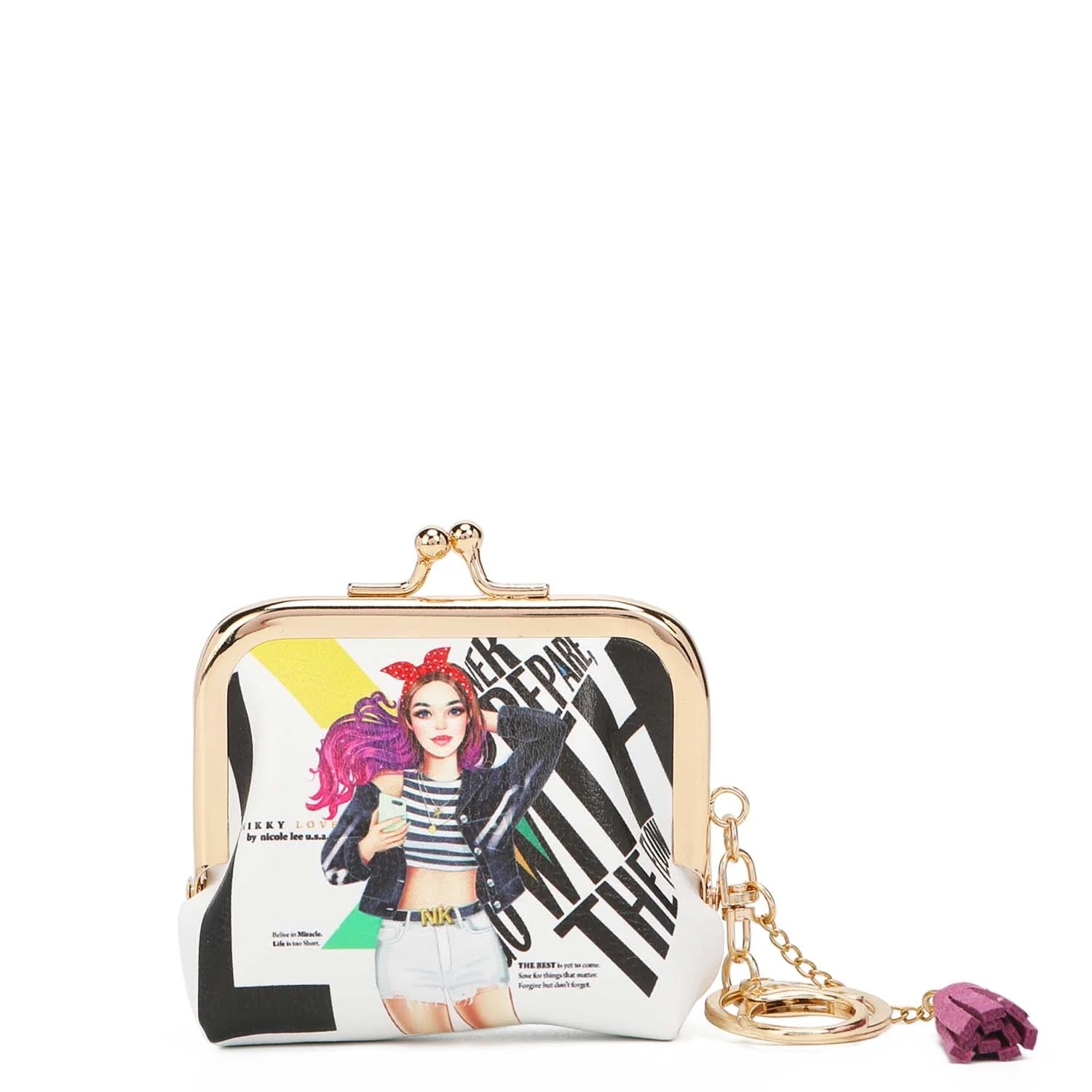 NIKKY by Nicole Lee. Kiss lock mini coin purse keychain with gold plated key ring made with eco friendly leather.