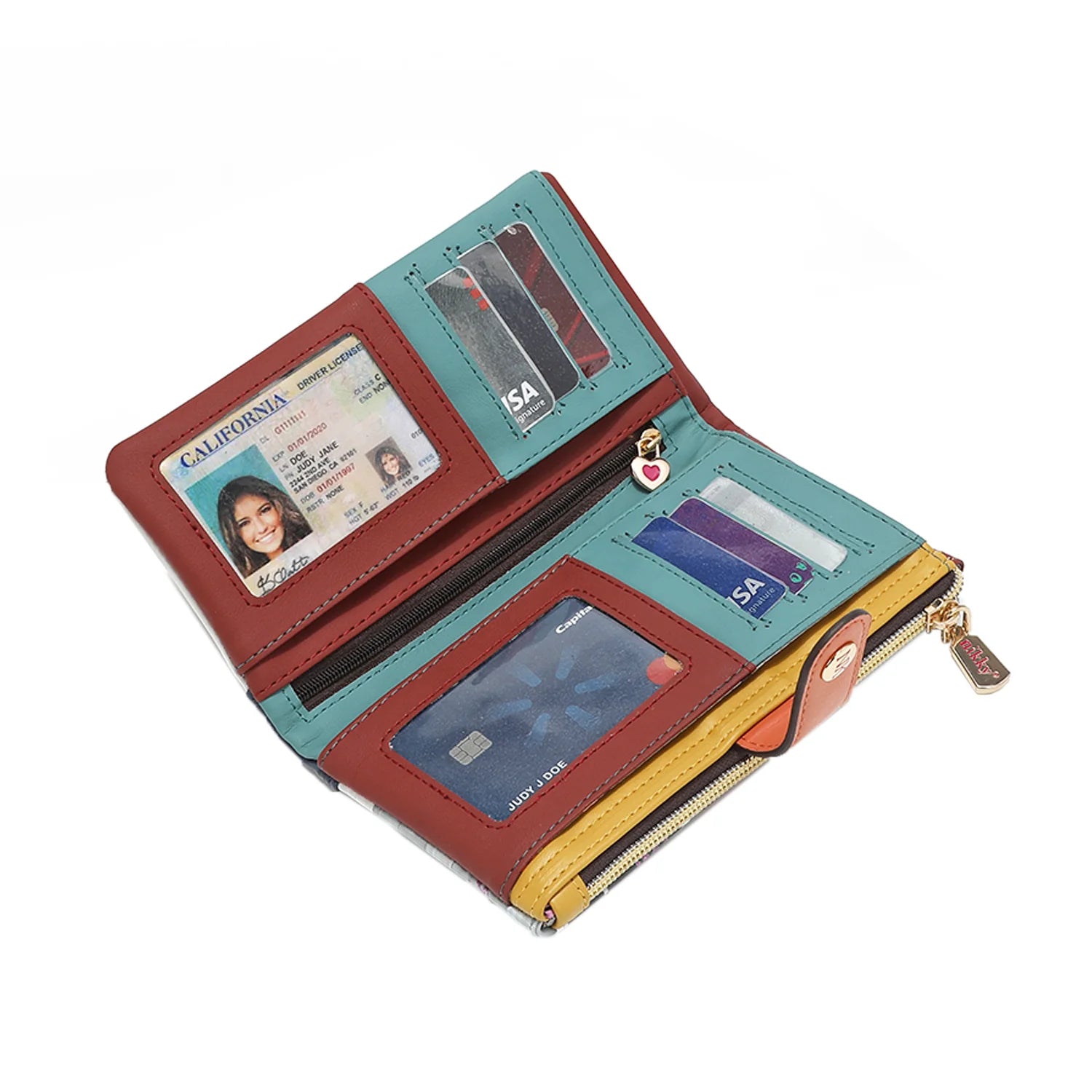 Bi-Fold Wallet to organize your cards, cash, and coins in style with this bifold zipper waller! its lightly-textured finish adds a modern flair and it's packed with pockets and slots, so you'll be sorted in no time! it's the perfect pick for people who take organizing seriously, but not themselves. Made of Smooth high quality eco-leather. Snap button closure with 2 fastener options with logo engraved round button. 7"L x 1"W x 3.75"H ANTI THEFT RFID (Radio Frequency Identity) BLOCKING TECHNOLOGY.
