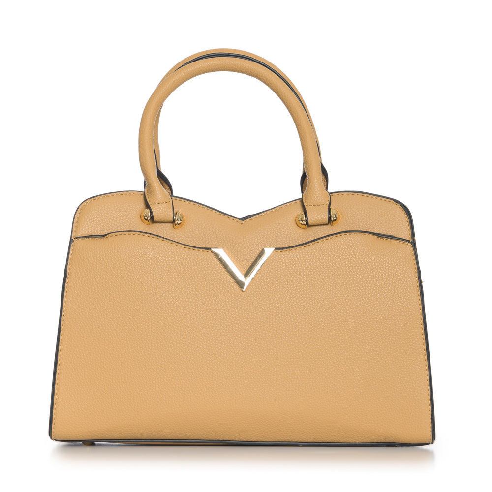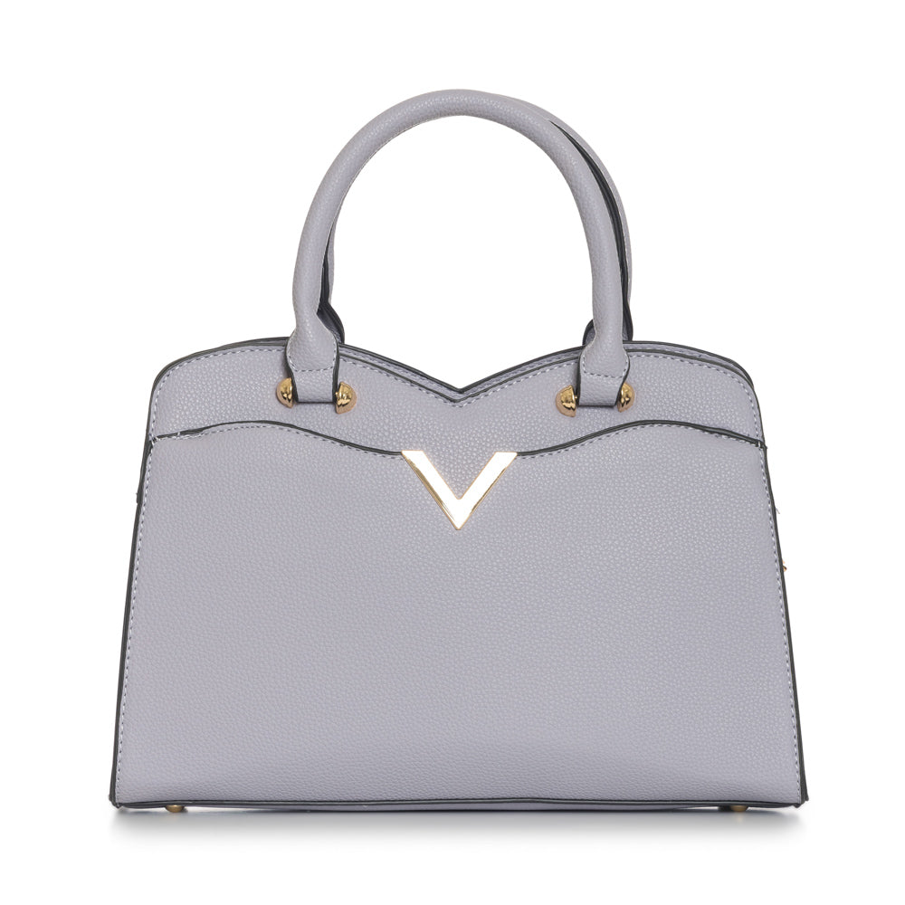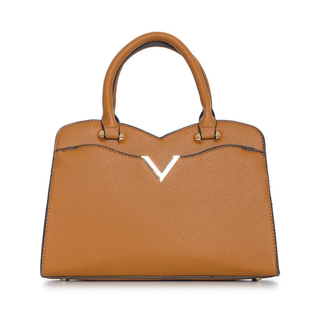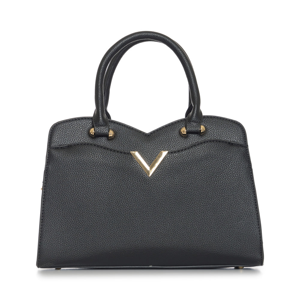 Fashion purse with V accent in gold. Adjustable strap included. 12 1/2"L x 3 1/2"W x 8 3/4"H