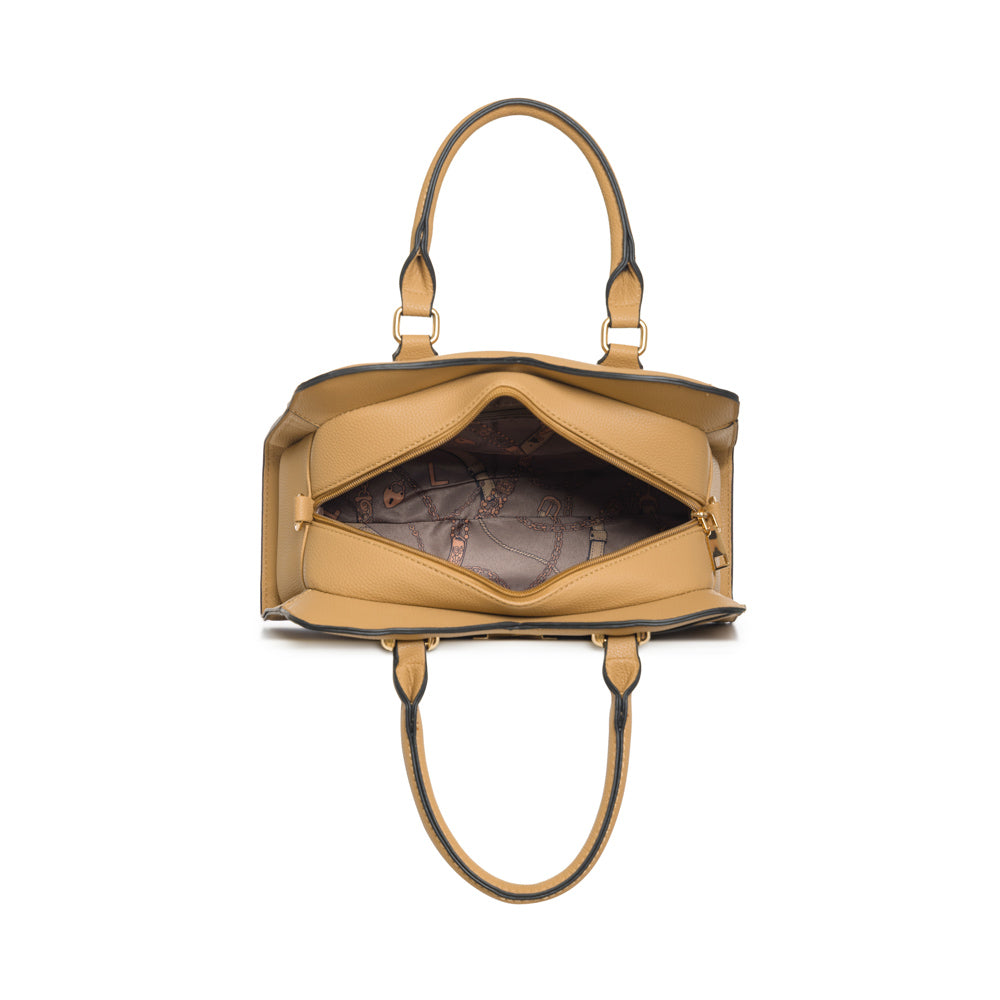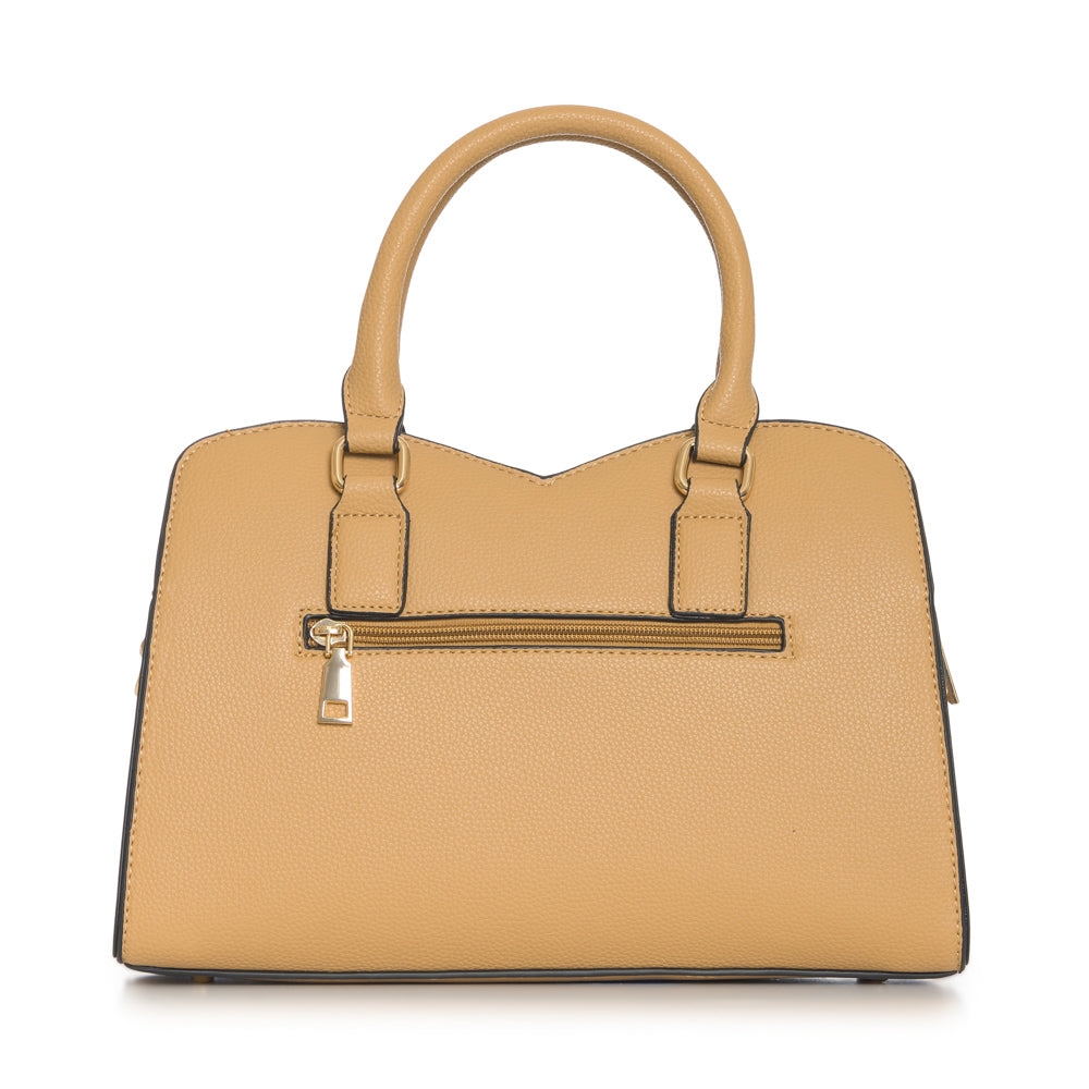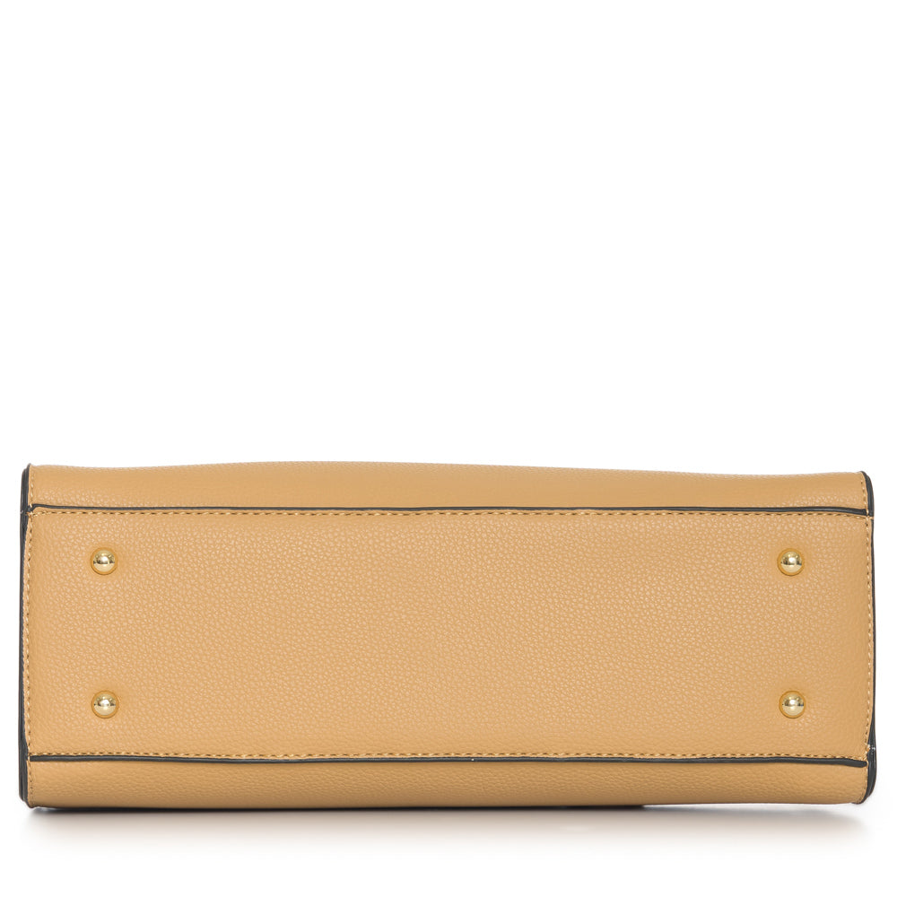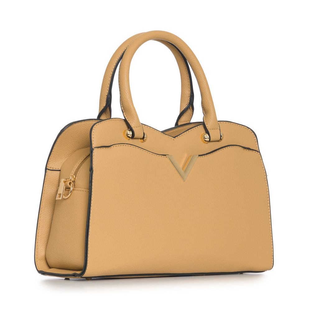 Fashion purse with V accent in gold. Adjustable strap included. 12 1/2"L x 3 1/2"W x 8 3/4"H